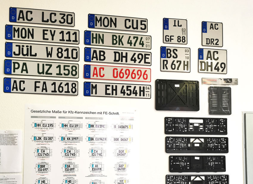 Wir sind ein DIN-zertifizierter Präge-Betrieb und fertigen alle Arten von KFZ-Kennzeichen zuverlässig und schnell an. Unser Produktangebot ist weitreichend. Neben Kennzeichenhalter in verschiedenen Farben, Materialien und Größen, bieten wir auch alle KFZ Kennzeichengrößen und Parkplatzschilder bis zu 70% günstiger als beim Schilderpräger an der Zulassungsstelle an. Gerne fertigen wir ihre Feinstaubplakette in Digitaldruck an.